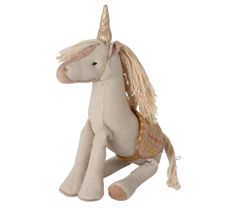 A magical story is about to begin. With this unicorn made in colourful tones and a golden horn, there are many stories to tell. The unicorn comes with a leash so you can ensure your new friend doesn't fly away.