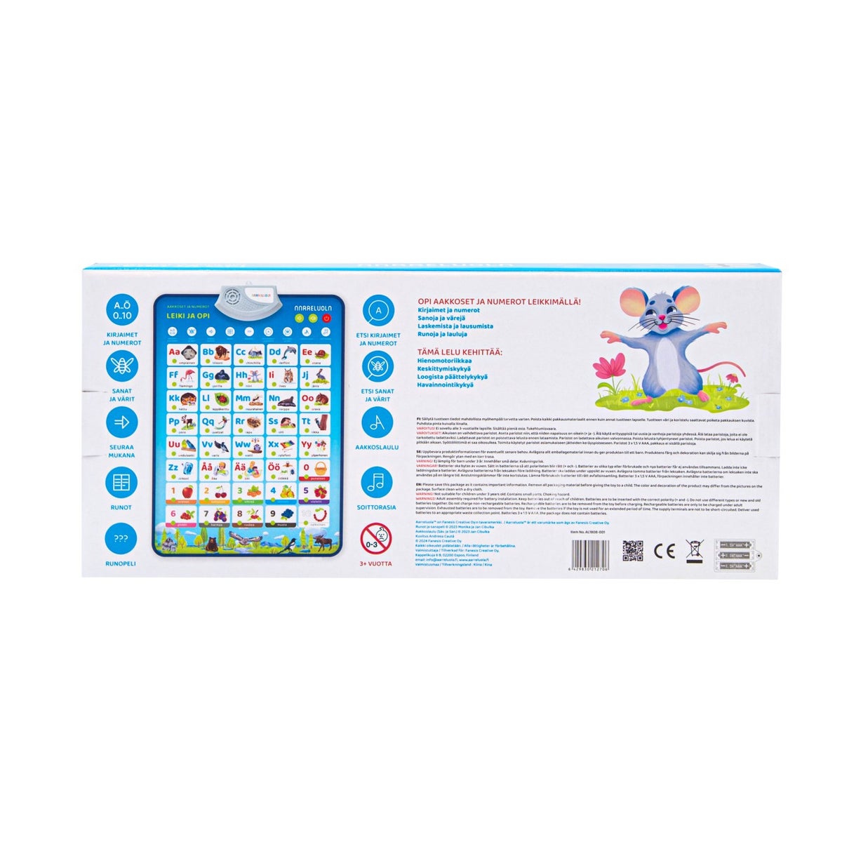 Tämä monipuolinen ja opettavainen pelitaulu tukee lapsen kielellistä kehitystä ja oppimistaitoja hauskalla ja innostavalla tavalla. Taulun avulla lapsi oppii aakkosia, numeroita, runoja ja lauluja – samalla kun kielitaito kehittyy leikillisesti.